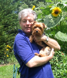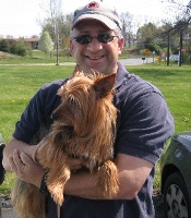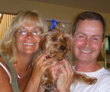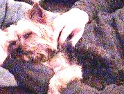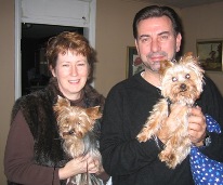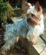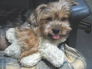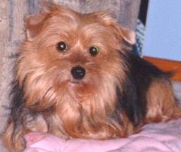 ![]() | Pudge is great! He's my little buddy. Wake up in the morning with him curled up in the crook of my legs or at my back. He's a real snuggler! Loves everyone. He's very sweet and affectionate tho' he tries to be the boss. That's his little terrier nature coming out. I've had no real problems with him other than tugging at the leash (he's surprisingly strong) which we have since overcome with the help of a trainer, and only one food agression incident with another bigger dog which was quickly averted, but I've had no problems taking things like old bones from him. He also plays soccer. I have a kid's plastic beach ball (about the size of a soccer ball) that he herds around with his front legs, then he whips his head sideways to bounce the ball off a wall, or if you throw the ball at him he bounces it off his nose. I call him 'Pele' Pudge! It's very amusing and he would play until he dropped if I let him. I took him to my vet who said he was a very healthy little dog and had good teeth for a Yorkie. I'm so glad we met that day- my good fortune and his! Thank you for your help in getting us together. Sincerely, Olive |