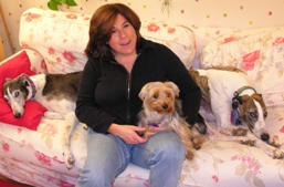 ![]() | Thought I’d send along a holiday picture of the three dogs and me. Cassie is settling in well and the greyhounds have accepted her. She’s managed to get the 11 year old greyhound to play! I definitely think she’s found her forever home! |