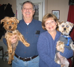 ![]() | We can't believe we have had little Colby (aka Cole) for almost 7 months now. He is the most adorable and affectionate yorkie we have ever had. He just loves life so much! He gets along beautifully with Ginny, our female yorkie that we adopted from you three and a half years ago. They snuggle up together and keep each other warm when it gets cold. They both sleep in bed with us at night. We are still working with Colby on his house training, but it is getting better. When we have him outside walking and we take him places he gets so many compliments on how cute he is! Colby has been such a wonderful joy to us and to our little Ginny as well. Thank-you for letting us adopt him. Susan, Gary, Ginny |
