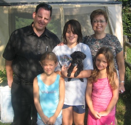 ![]() | Thanks for the beautiful puppy! What a treat he is! If only I could remember to call him "Him" instead of "Her" when I talk about the puppy. Mocha doesn't quite know what to think. She barks at the puppy and we try to sssshhh her. I think she is confused and wants the puppy to know this is her house. The girls are loving the puppy and he is so playful with all of us and even wants to play with barking Mocha. He chases after her and wants to play. We all napped a little on the loveseat today and Mocha was calm and quiet. The puppy curled up right next to me. I gave him the Nutra Cal, but he doesn't want to eat. We keep trying. He also doesn't like being put in the kennel we have for him. He barks and barks. But I think he will get used to it. We are back to the puppy phase again and have to recall all that we were careful of with Mocha. We are thinking of renaming him Max Hamilton Fidler. WE like Max because it is short and easy to remember and calling for Mocha and Max is easier to say. We will keep in touch. Just want you to know how pleased we are so far with the new puppy. I hope that you find wonderful homes for all of your dogs real soon! God Bless! The Fidlers |