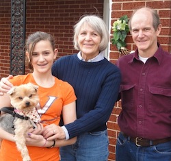![]() | Teddie seems happy and is doing well. He's feisty, loving, and playful. We're still working on house training (he hates the rain and snow!). But he picks up other commands really quickly. You can see in the picture that he's trying to escape Emma's arms--it took about 12 shots to get one with all the animals in the frame. He's afraid of the bunny so he kept trying to run away. Teddie's favorite part of the day seems to be walking Emma to and from school because he gets to greet all the kids. He's like a little mayor, especially with his various sweaters and jackets on. You were right that Teddie is perfect for us. He sleeps with Emma and he is a fierce defender of our home! He's also gotten used to my office at work (and he loves college kids too). I think we all feel that he is a full member of our family now. We are so grateful you matched us with him. Warmly, Beth |